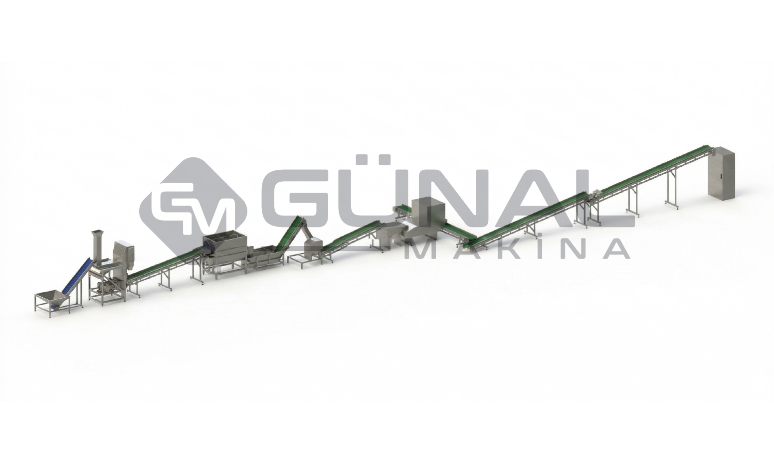 Gıda işleme tesislerinde, tarladan gelen dökme sebzelerin (patates, havuç, bezelye, brokoli vb.) IQF (Bireysel Hızlı Dondurma) tünellerine girmeden önceki tüm hazırlık, temizlik, boyutlandırma ve son kalite kontrol aşamalarını kesintisiz bir akışla gerçekleştirmek için tasarlanmıştır. Belirli bir mühendislik sırasına göre birbirine tam entegre çalışan bu yüksek kapasiteli hat, ürünlerin besin değerini ve formunu koruyarak dondurma işlemine sıfır fireyle, en ideal standartta girmesini sağlar.