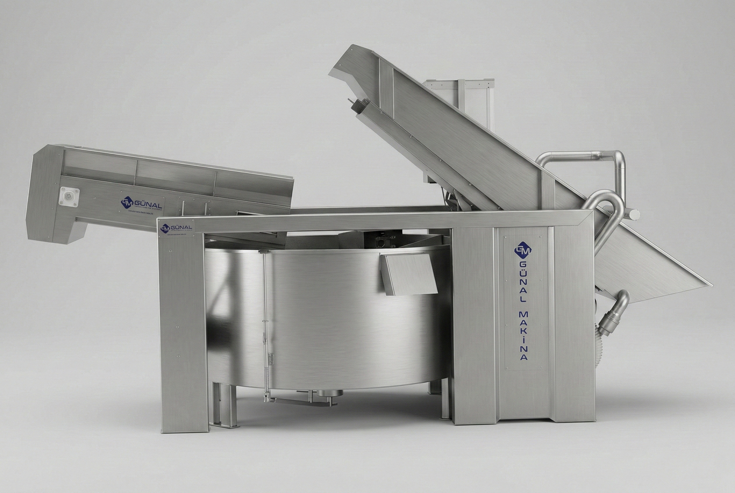 Salça üretim tesisleri için geliştirilen Domates İndirme, Seçme ve Yıkama Hattı; tarladan gelen ürünün fabrikaya girişinden itibaren yüksek hijyen, minimum fire ve maksimum verimlilik sağlar. Hidrolik taşıma ve hassas yıkama teknolojileri sayesinde domatesler darbe almadan taşınır, doğal yapısı korunur.